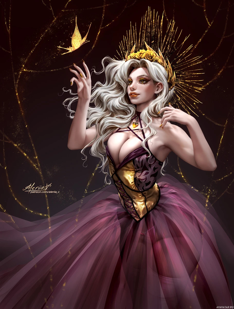 a female character with white hair and a butterfly motif. She is wearing an ornate, gold-