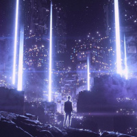 На картинке изображен силуэт человека, стоящего ночью на скалистой местности в свете различных огней, которые излучают потустороннее сияние. На заднем плане видны высокие сооружения, которые кажутся футуристическими или, возможно, инопланетным городом. Небо усыпано звездами, что создает атмосферу научной фантастики или фэнтези в этой сцене.