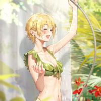 a green bikini and seems very happy while being sprayed by a water hose. The setting looks like a tropical or exotic location with