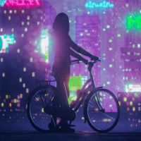 The image shows a silhouette of a person riding a bicycle at night. The background features neon lights that create a colorful and vibrant atmosphere, likely in an urban setting. This could be a depiction of a city street or alley with the ambient lighting contributing to the artistic feel of the scene.