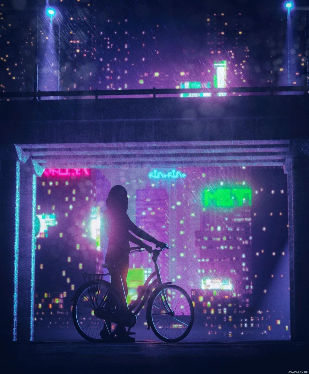 На картинке изображен силуэт человека, едущего ночью на велосипеде. На заднем плане изображены неоновые огни, которые создают красочную и яркую атмосферу, вероятно, в городских условиях. Это может быть изображение городской улицы или переулка, а окружающее освещение способствует художественному оформлению сцены.