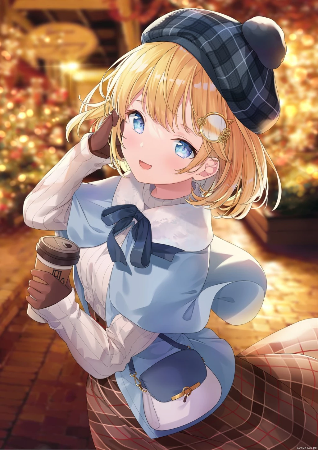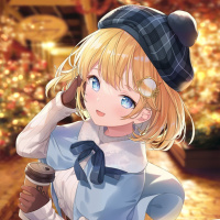 the Christmas season. The character seems cheerful, as she's smiling and looking directly at the viewer, holding a cup that could possibly contain
