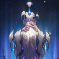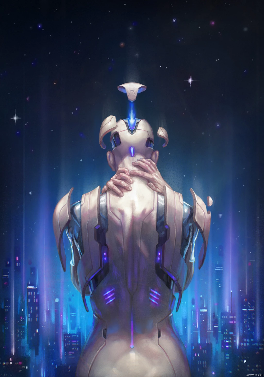 advanced technology or cybernetics. The background suggests a futuristic city or space station, with starry skies and