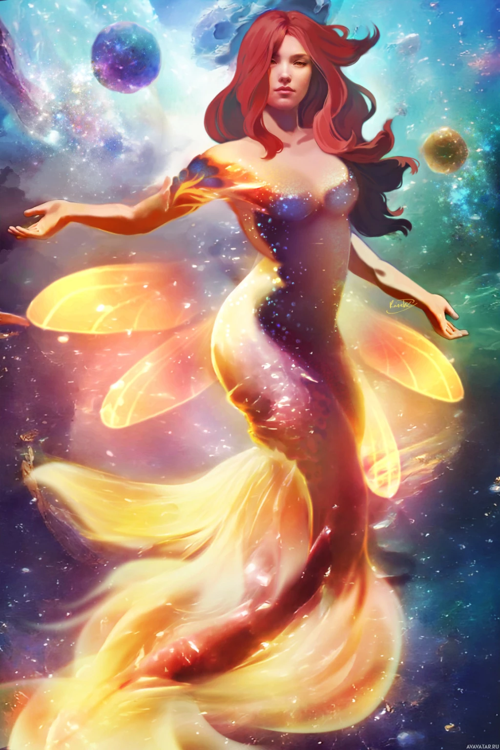 red hair and appears to be emerging from the ocean, with her tail shimmering and scales glowing in hues of yellow and orange. The background is a vibrant depiction of space, with stars and planets visible around her. There's also an aurora-like light emanating from her body, giving off a magical and otherworldly vibe. This type of image would be associated with the fantasy and art genres.