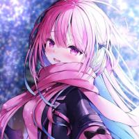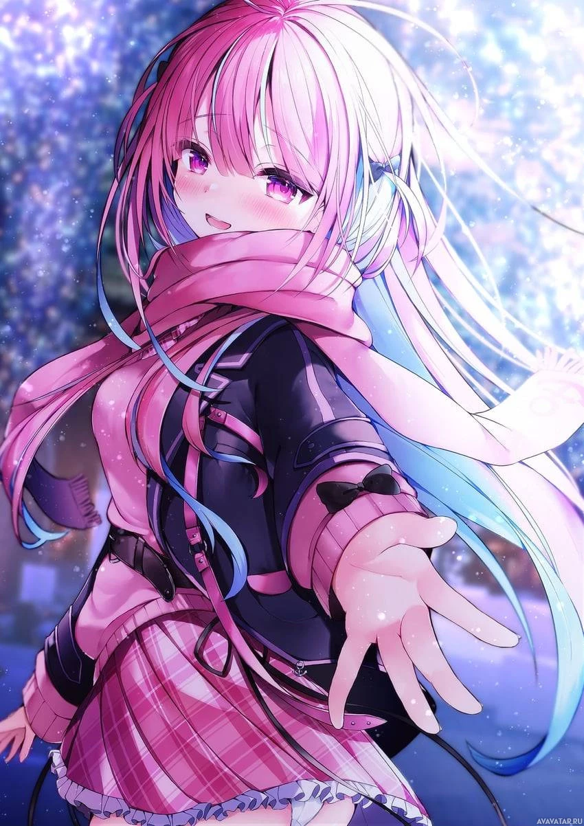 pink hair and is wearing a black outfit with a fluffy scarf around her neck. The character is making a gesture that could be interpreted as reaching out to someone or something in front of her. The background features what appears to be