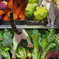 The picture features a cat in the foreground, interacting with vegetables. In the background, there is an assortment of fresh produce including broccoli and carrots. The image includes colorful illustrations, possibly aimed at highlighting the health benefits of vegetables or the importance of providing pets with nutritious food.