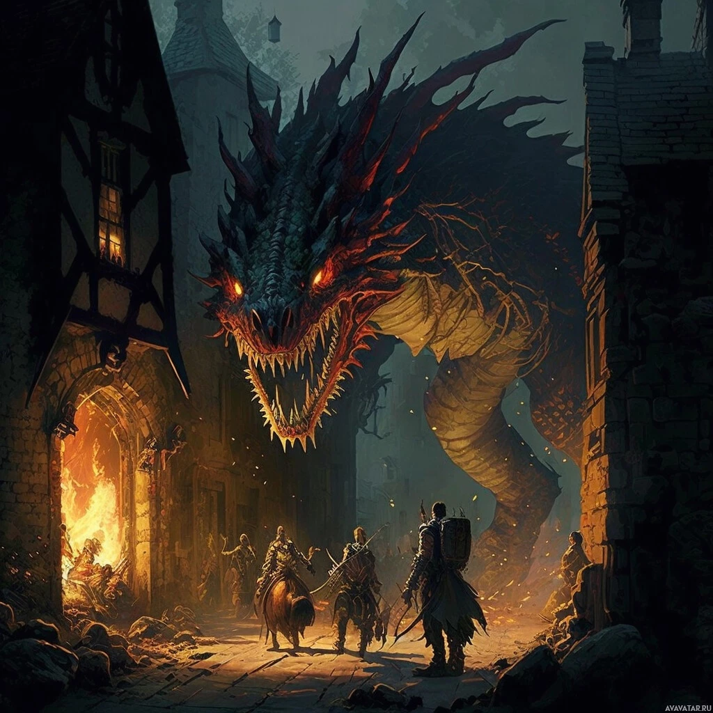 a fierce expression, as if it were about to breathe fire or attack the group. The setting appears to be in an old town with