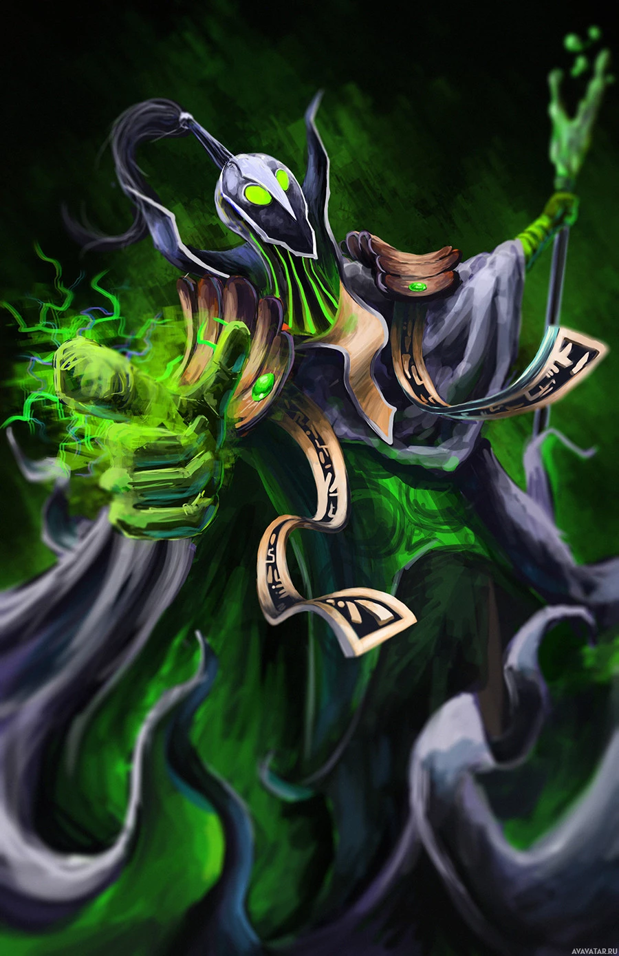 various forms such as lightning or green smoke, which can be seen being wielded by him in this illustration. Rubick's attire and the style of the image suggest it could be a promotional artwork or fan-made piece representing