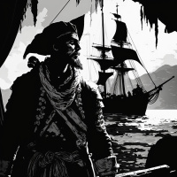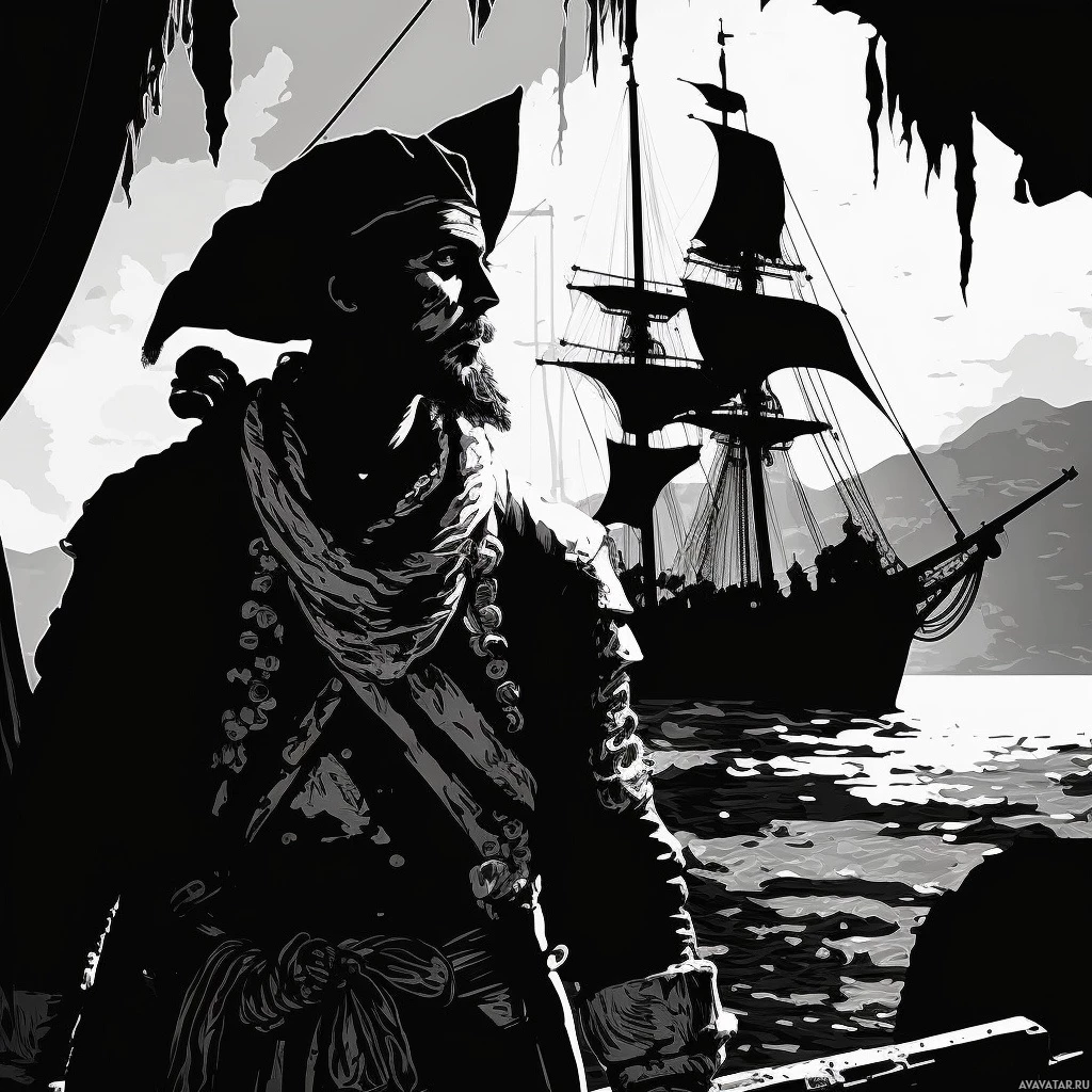 ship sailing on the sea. The character appears to be looking out towards the other ship, suggesting an interaction or encounter between the two vessels.