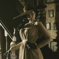 the video game "Resident Evil." The character is styled with a hat and a long dress that resembles those worn by