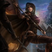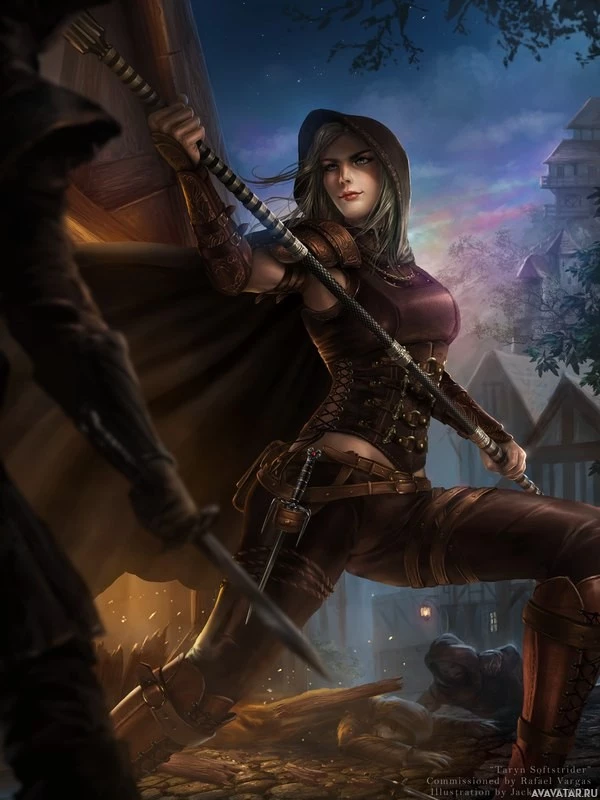 a hooded cloak that covers part of her head and shoulders, giving her a mysterious or perhaps villainous appearance. Her expression is intense, suggesting she might be engaged in combat. In the background, there are faint silhouettes that could represent figures from