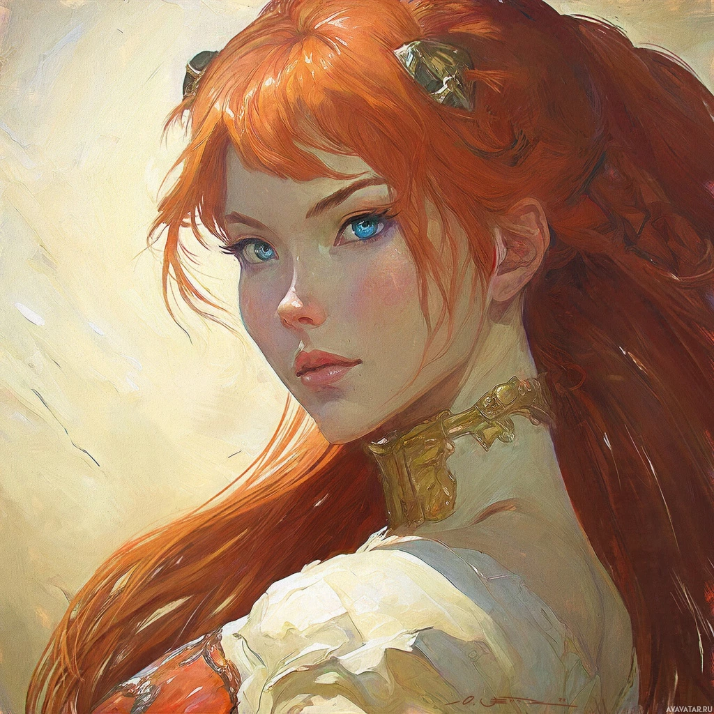 На этой иллюстрации изображена девушка с рыжими волосами. У нее голубые глаза, и она задумчиво смотрит в сторону. Персонаж, похоже, стилизован под фэнтези или историческую моду, с тщательно продуманными деталями одежды, которые наводят на мысль, что она может быть героиней рассказа или художественного произведения.