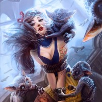 a female character with cat-like features, such as ears and possibly feline eyes or fur, sitting on the ground surrounded by several small, anthropomorphic creatures that resemble goblins. These creatures have pointed ears,