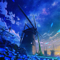 a nighttime scene featuring a windmill in the foreground with its blades silhouetted against the stars. In the background, there's a field covered in