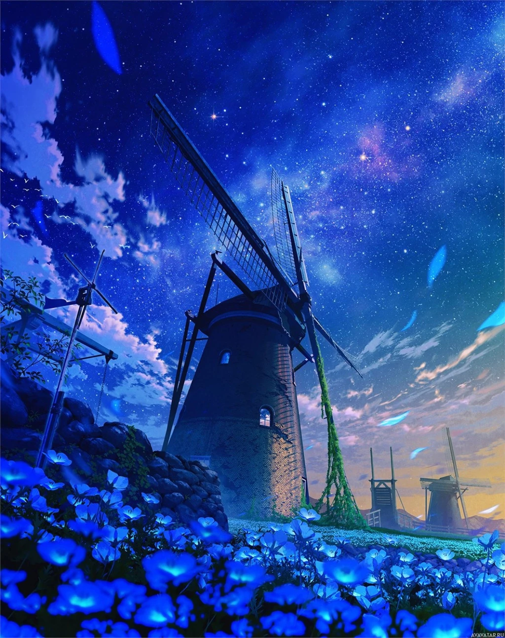 blue flowers, which could be poppies or another type of blue flora. The sky is dark and filled with stars, suggesting it is set at night. There are also some clouds that appear to be illuminated by moonlight or starlight, adding to