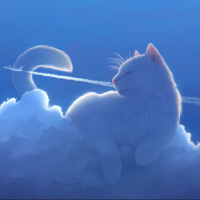 a peaceful expression and appears to be looking at something off-frame. In the background, there are other clouds and a crescent moon, creating