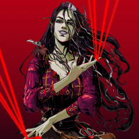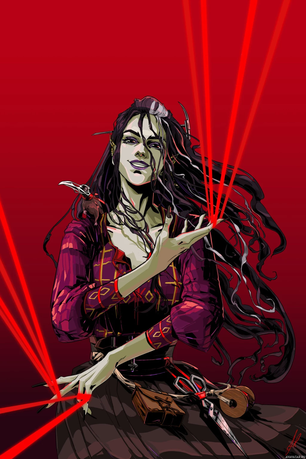 red beams or light emanating from her hand adds to the magical and mystical atmosphere of the image.