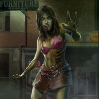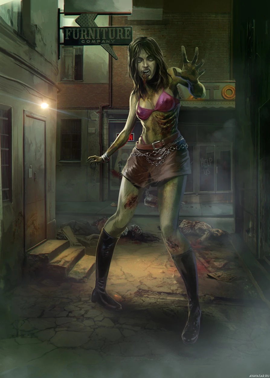This image depicts a woman in a zombie-like state, standing in what appears to be a rundown