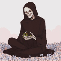 На картинке изображен скелет, одетый во что-то похожее на монашескую рясу. Он сидит на земле, окруженный цветами и сорняками, что наводит на мысль о том, что он находится на открытом воздухе. Скелет сложил руки в жесте, который можно интерпретировать как молитву или медитацию. Общая атмосфера картины безмятежна и в то же время мрачна из-за присутствия скелета.