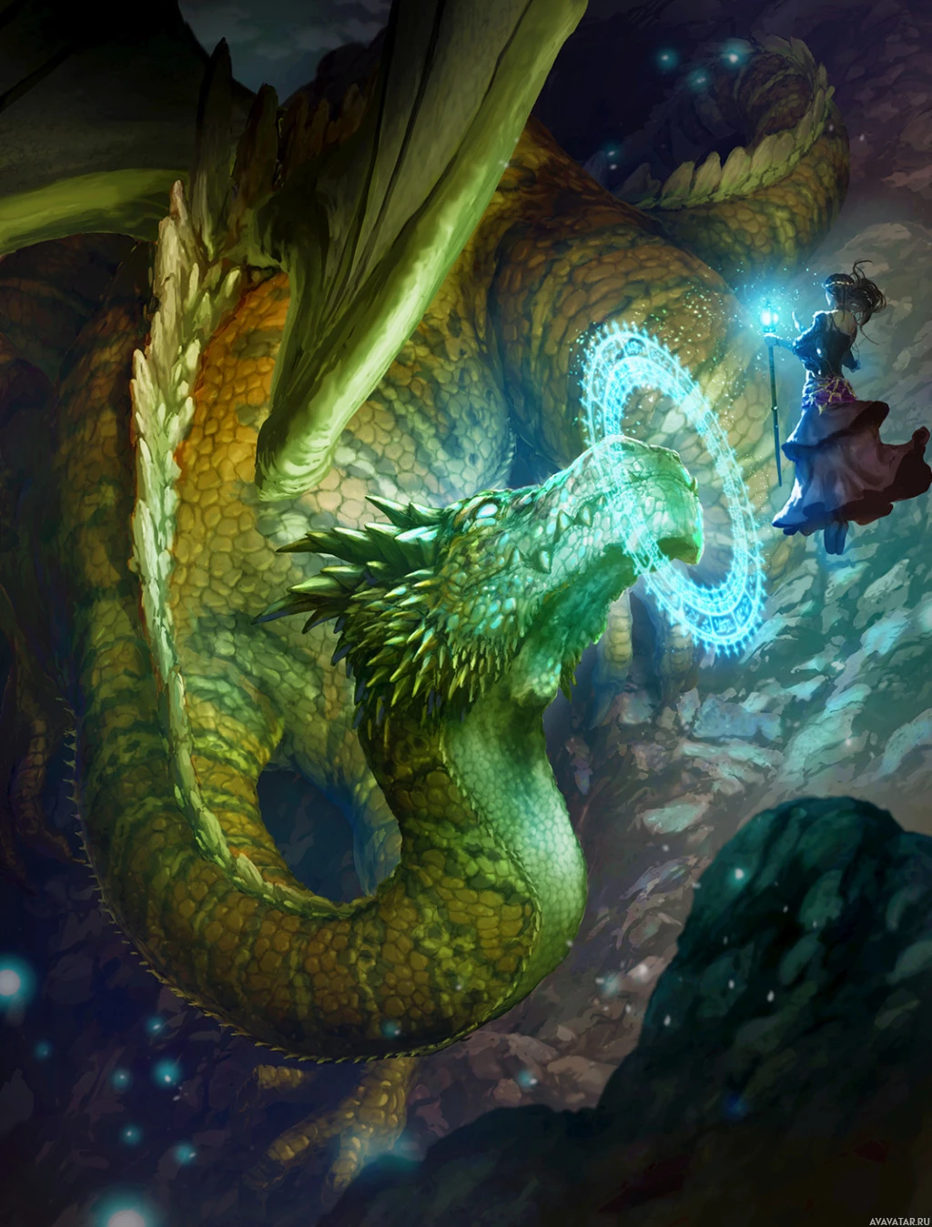 a mystical atmosphere, indicated by the lighting and the magical elements in play.