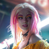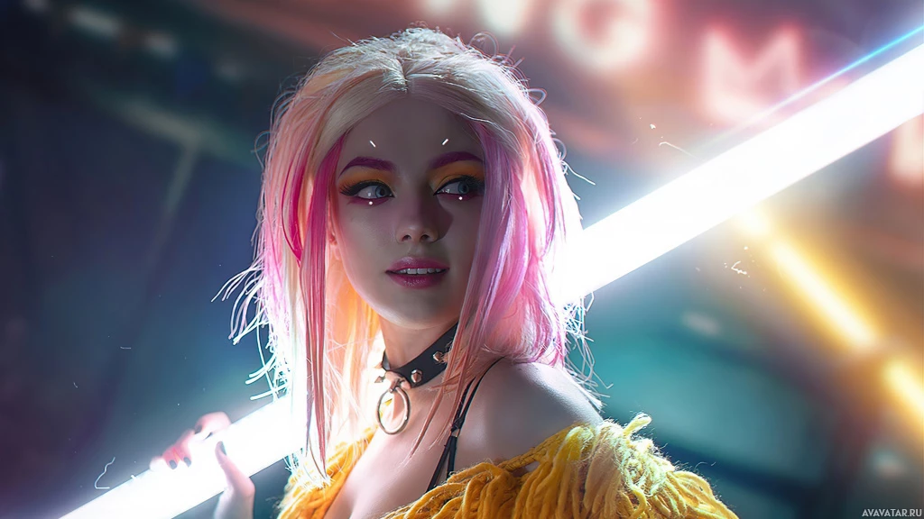 pink hair, possibly styled in dreadlocks or braids. They are wearing bright makeup and striking clothing that includes
