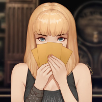 a card game, holding several yellow playing cards close to her face as if she is about to reveal them. The setting looks like a casino or a bar with