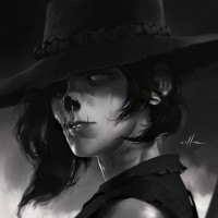 a cowboy hat and appears to have some sort of makeup or prosthetics on her face, giving her a somewhat undead look, which might suggest she's portraying a zombie or a similar undead character. The art style is realistic with