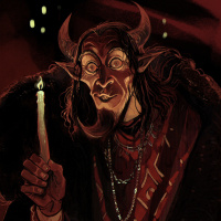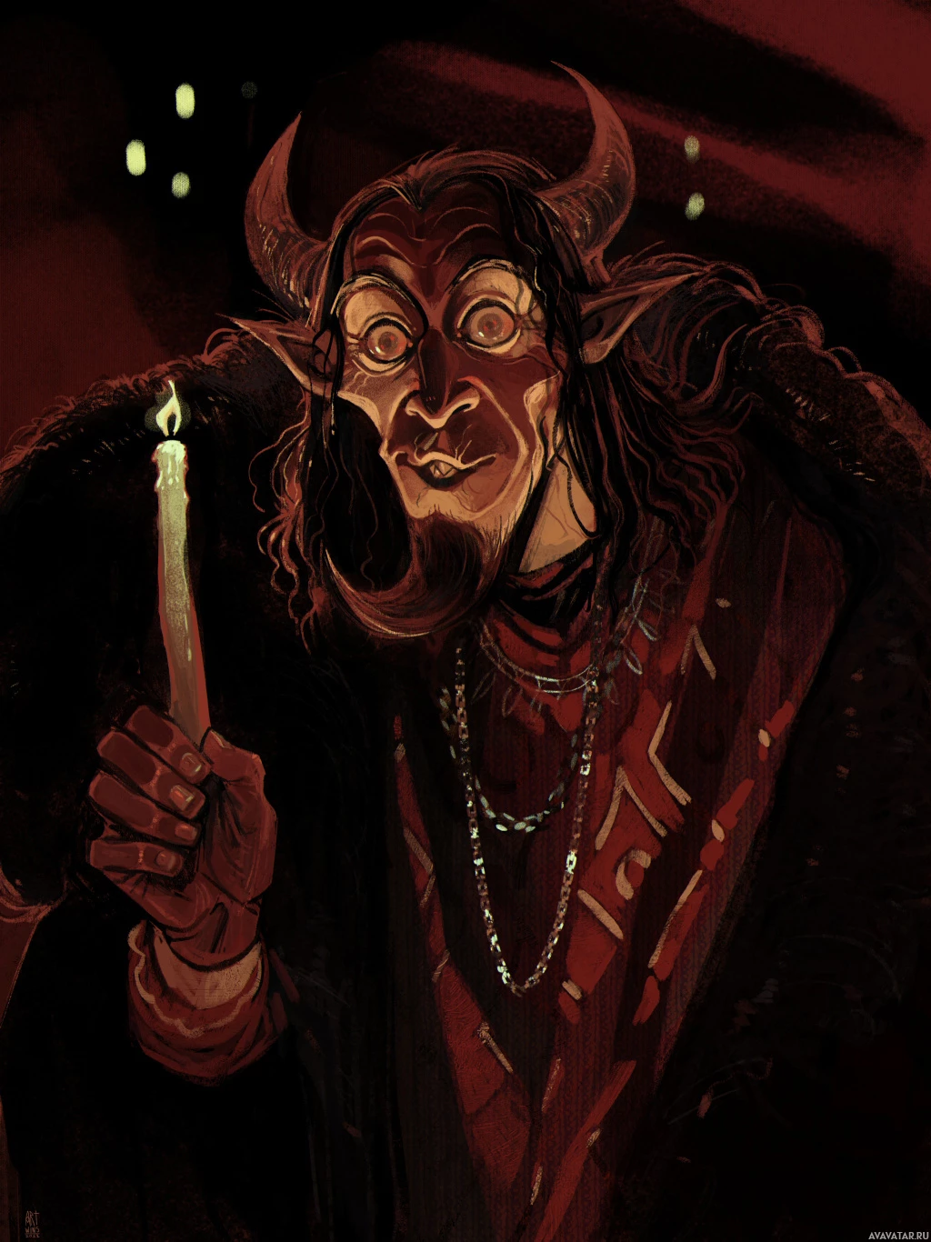 a lit candle in one hand and seems to be casting a spell or performing some kind of magical ritual. The overall tone of the picture is dark and mysterious, fitting for a fantasy setting where demons might be commonplace or feared.