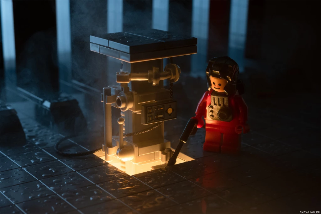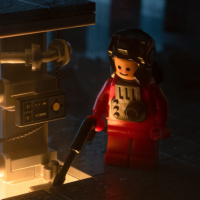 a LEGO scene where a small character, resembling an astronaut or space explorer, is interacting with what appears to be a LEGO model of a spaceship. The scene has a dark and dramatic atmosphere, with