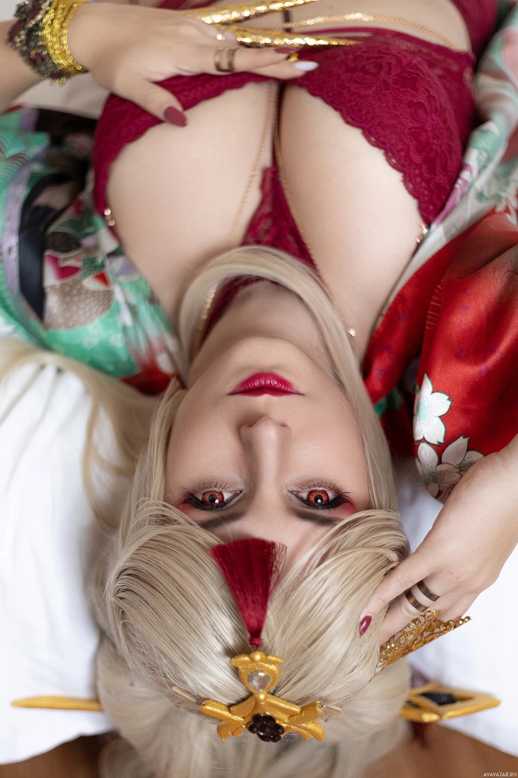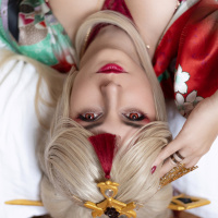 blonde hair and are wearing makeup that includes red lipstick, gold accents around the eyes, and red nail polish. The individual is dressed in a fantasy-themed costume that seems to be inspired by anime or manga styles, complete with what appears to be a crown on their head and what could be a mask covering part of their face. There are also traditional Japanese motifs such as
