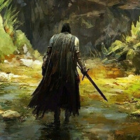 historical narrative. There is an individual who seems to be a warrior, as indicated by the sword they are carrying. This person is standing in front of