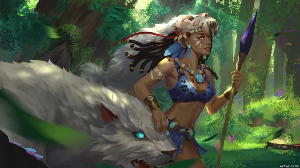 a female character dressed in ancient or fantasy attire, reminiscent of a warrior or a huntress. She has long