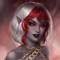 red hair, pointed ears reminiscent of elves or fairies, and a pale complexion with reddish eyes that could suggest she is a vampire or another supernatural entity. The character is adorned in elaborate
