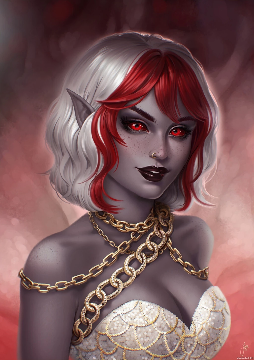 costume jewelry including chains, a necklace, and what seems to be a chainmail-style bodice. Her makeup and clothing are designed to give her an otherworldly appearance, fitting the fantasy theme of the illustration.
