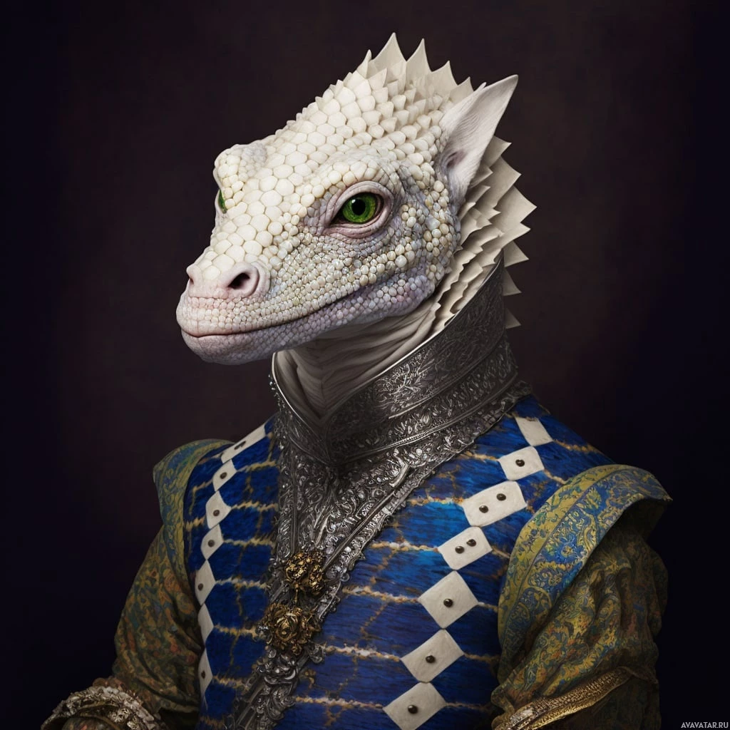 intricate designs, suggesting a high-ranking status within a fantasy context. The fantastical elements include the combination of human and reptilian features, which are not found in