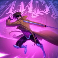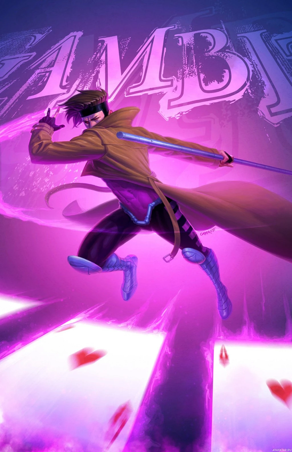 an animated character who resembles Gambit, a popular superhero from the X-Men comics. He is depicted in mid-action with dynamic posture and