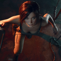 The image shows a character who appears to be Lara Croft from the Tomb Raider video game series. She is depicted in a dynamic pose, as if she is climbing or descending down some stairs or steps. This character is known for her adventurous spirit and archaeological endeavors in various exotic locations.