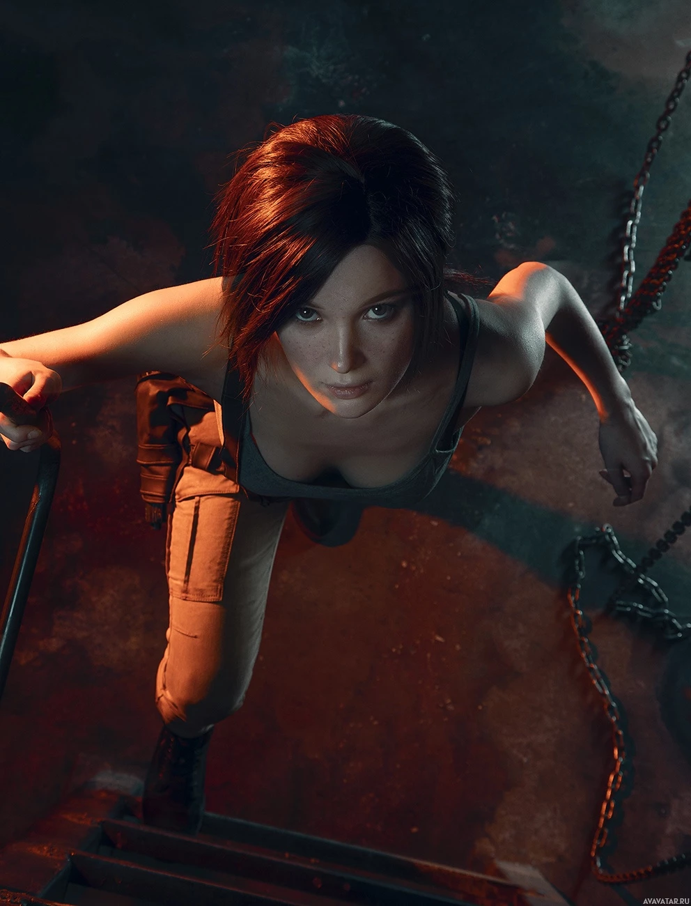 На картинке изображен персонаж, похожий на Лару Крофт из серии видеоигр Tomb Raider. Она изображена в динамичной позе, как будто поднимается или спускается по какой-то лестнице или ступеням. Этот персонаж известен своим духом авантюризма и археологическими изысканиями в различных экзотических местах.
