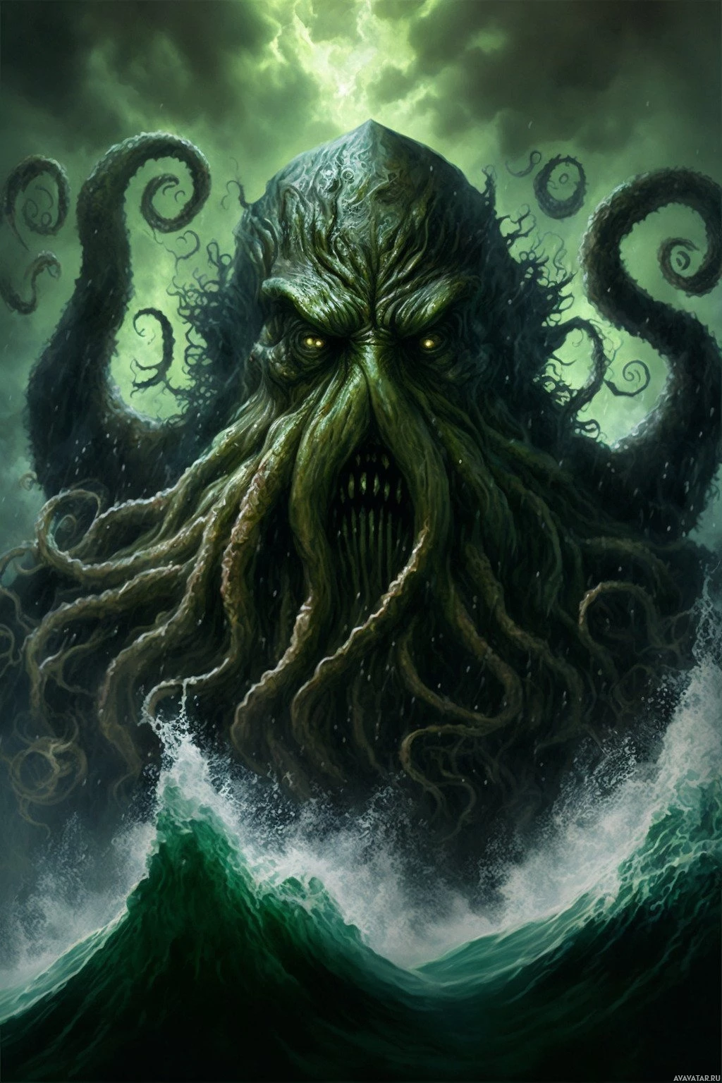 The image features a fantasy artwork depicting a creature resembling Cthulhu, which is