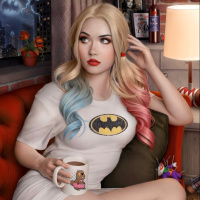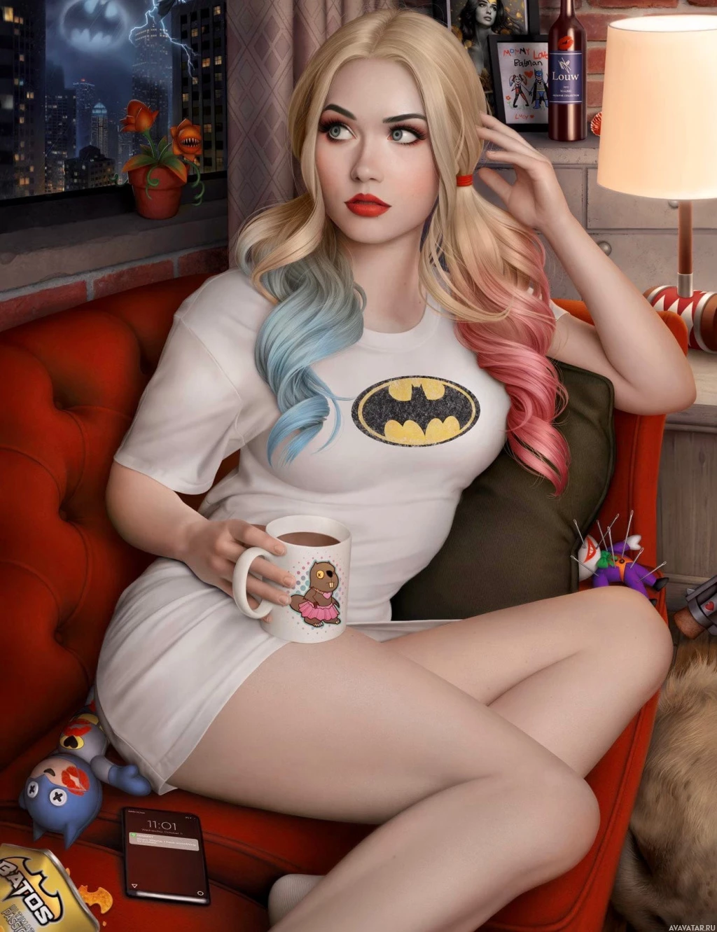 Harley Quinn, sitting on a couch in an indoor setting that resembles a living room. She is wearing a white Batman t-shirt and has her hair styled with two ponytails colored like the bat emblem from the comic