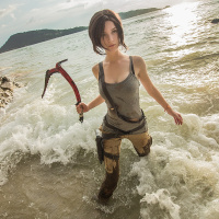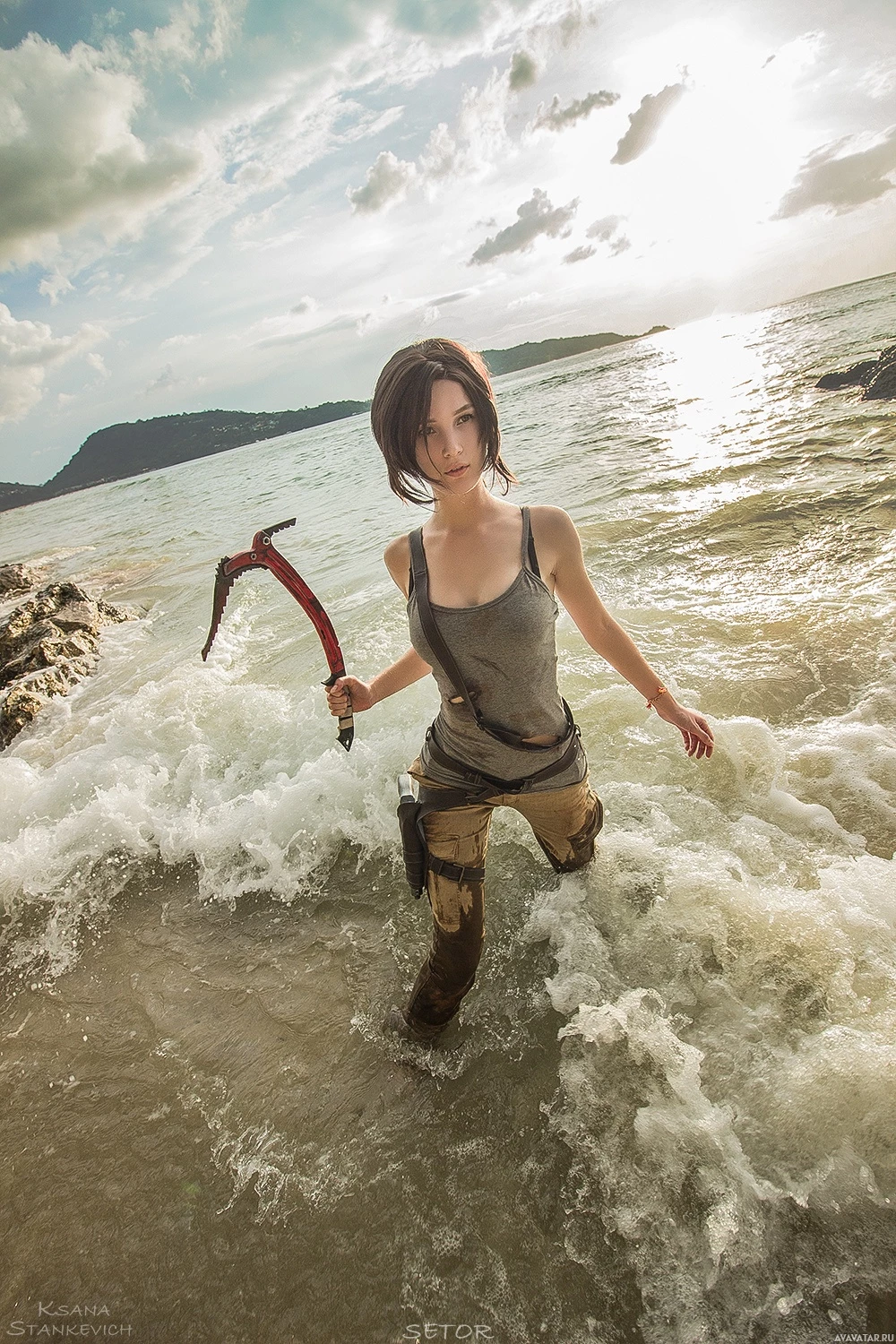 The image shows a person dressed as Lara Croft from the Tomb Raider video