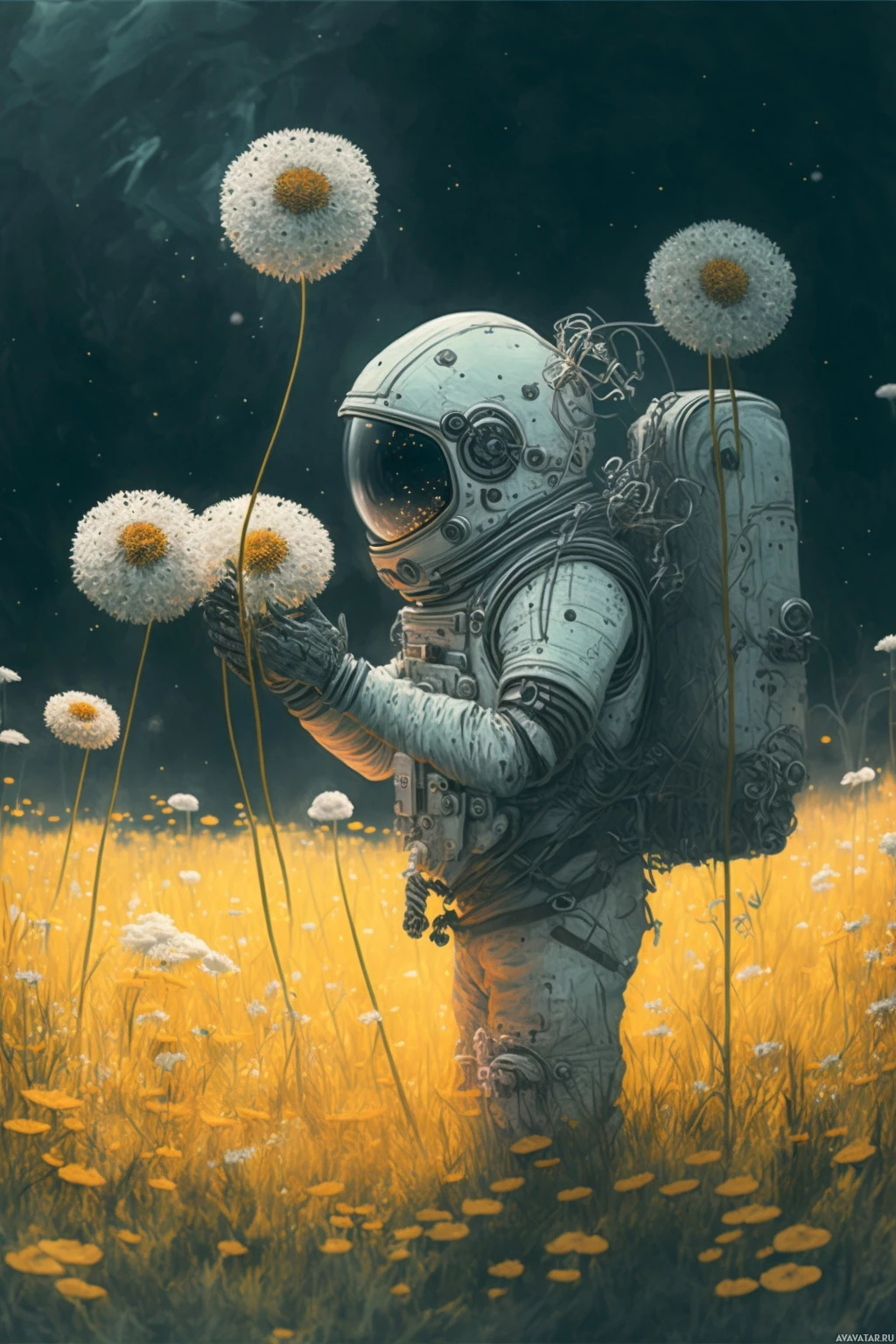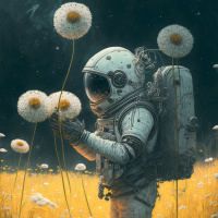 This image depicts an astronaut in a space suit holding dandelions. The background is dark, possibly representing the night sky or outer space, which contrasts with the bright yellow flowers. It's a creative and whimsical concept that combines elements of space exploration with nature.