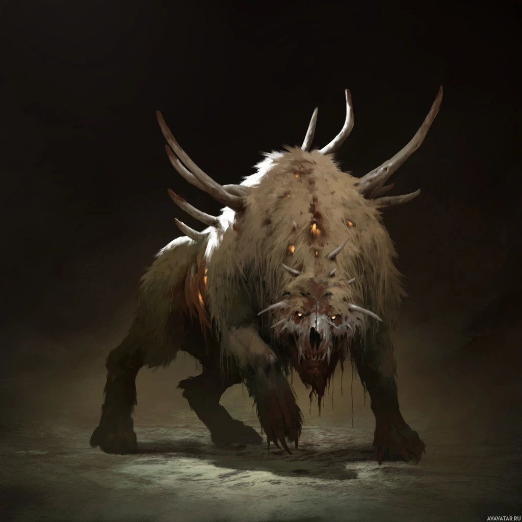 a fantasy creature that appears to be designed in the style of a monster. It has several features commonly associated with horror or fantasy themes, such as