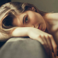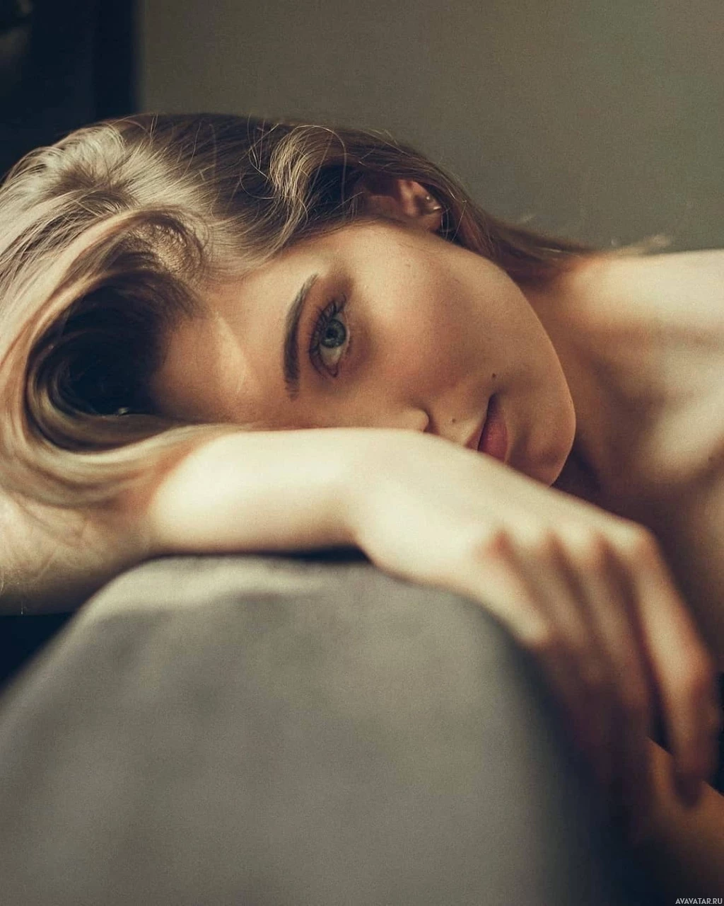 На картинке изображена женщина, голова которой покоится на чем-то, напоминающем край дивана или кресла. Ее взгляд направлен в сторону от камеры, а поза расслаблена. На картинке мягкий фокус, подчеркивающий тонкие черты лица объекта съемки. Общее настроение фотографии - безмятежное и созерцательное.