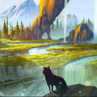 natural landscape with mountains, waterfalls, and forests. In the center of the scene, there is an animal silhouette that appears to be a fox, sitting atop what looks like
