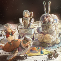 a whimsical scene where various characters are gathered on the surface of what appears to be the moon or another celestial body. There's an astronaut, who is sitting upright, holding what seems to be a tablet or a book. To the left, there's a character that resembles a rabbit with large ears, wearing glasses and sitting on its