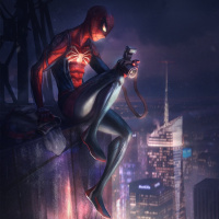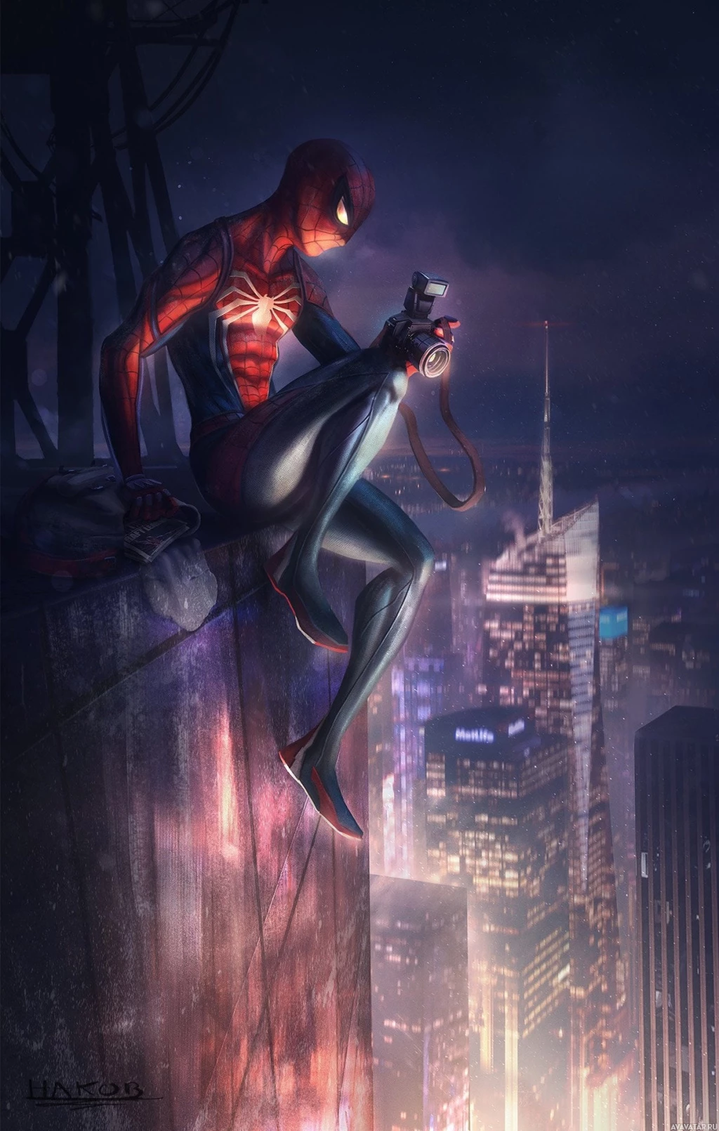 the spider emblem on his chest, and he has a web shooter on each wrist. Spider-Man appears to be sitting or perched on a high
