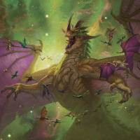 a fierce expression on its face and is surrounded by various creatures that could be considered fantastical or mythical in nature. These creatures are scattered around the dragon, some seemingly flying towards it, creating a dynamic and lively atmosphere. The background suggests an otherworldly setting, possibly a magical forest or enchanted area with