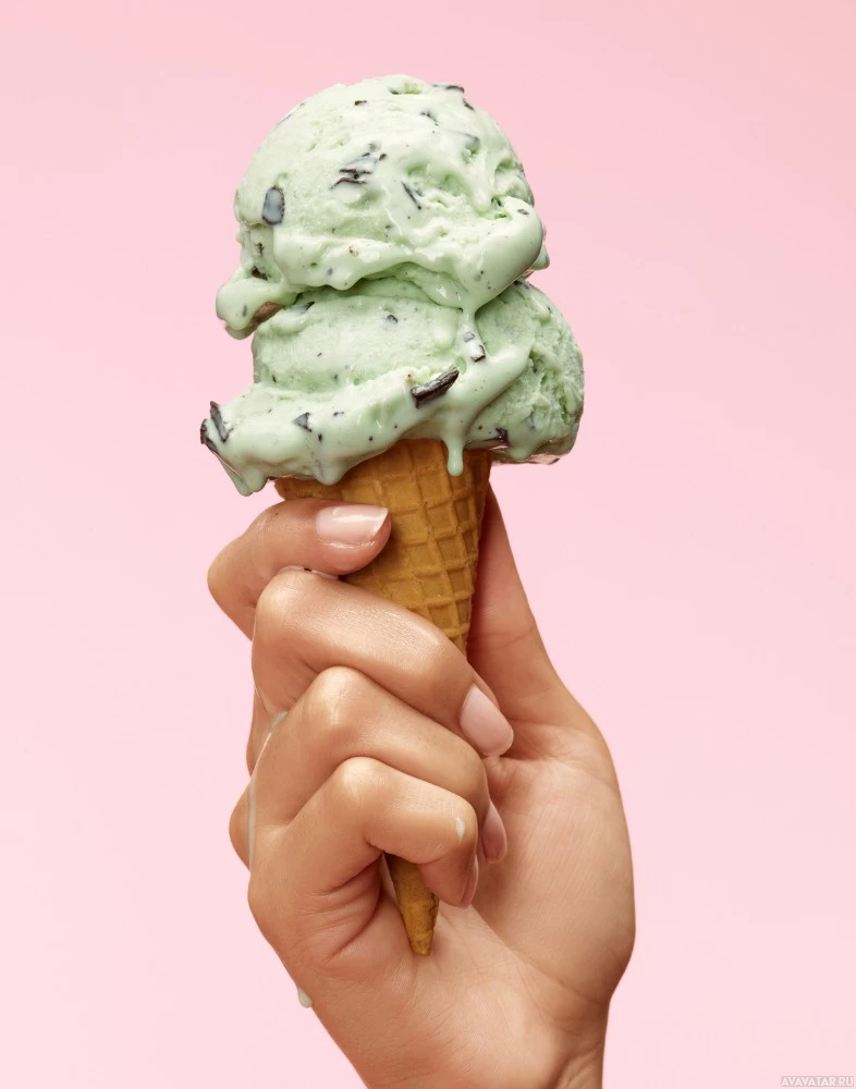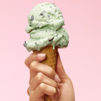an ice cream cone. The cone appears to be filled with green ice cream, possibly mint or matcha flavored, and it is adorned with some chocolate crumbles on top. The background features a gradient of