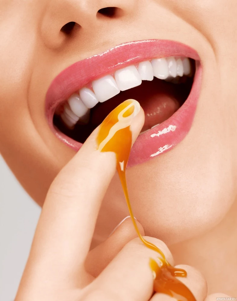 a state of enjoyment or anticipation. A finger is seen holding what appears to be honey or some other